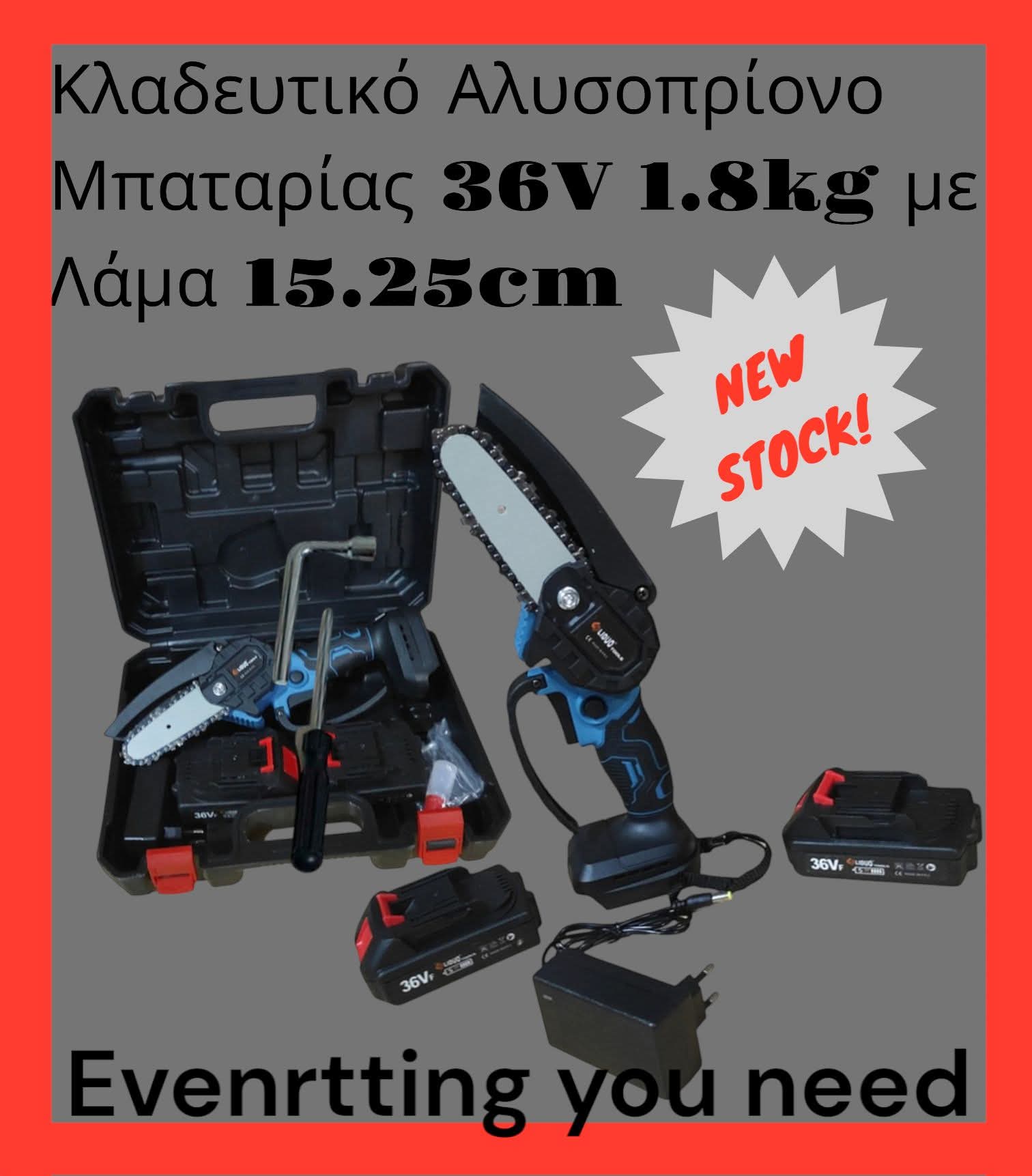 Το αλυσοπρίονο λειτουργεί με μπαταρία 36 volt, δεν παράγει καυσαέρια και είναι ιδανικό για κλάδεμα δέντρων και κοπή ξύλων, σε κήπους και χωράφια όπου δεν υπάρχει πρόσβαση σε ηλεκτρικό ρεύμα.