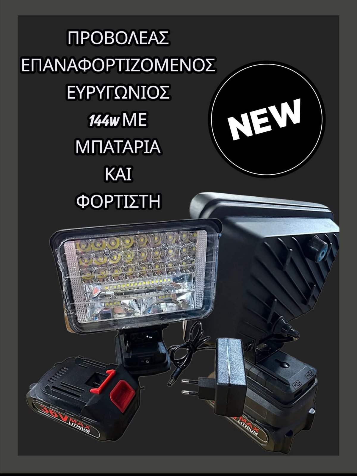 ΠΡΟΒΟΛΕΑΣ ΕΠΑΝΑΦΟΡΤΙΖΟΜΕΝΟΣ ΕΥΡΥΓΩΝΙΟΣ 144w ΜΕ ΜΠΑΤΑΡΙΑ ΚΑΙ ΦΟΡΤΙΣΤΗ